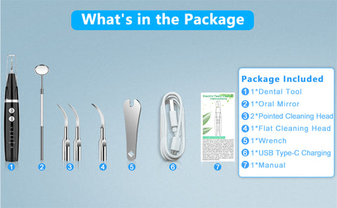 【5 cleaning modes &3 cleaning head】 5 cleaning modes with different strengths to meet the needs of different teeth cleaning.Soft mode cares for sensitive teeth, Normal mode comfortably massages gums, Middle mode removes hidden dirt, Strong mode removes moderate stains, and Super Strong mode removes heavy stains. The scaler also comes with 3 non-rusting, anti-corrosion and wear-resistant 304 stainless steel cleaning heads. 2 pointed cleaning heads and 1 flat cleaning head